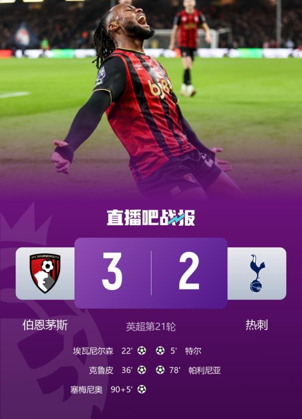 伯恩茅斯3-2战胜热刺,塞梅尼奥95分钟绝杀。此前talkSPORT报道,塞梅尼奥坚持为伯恩茅斯出战(球员解约条款10号截止),希望帮助球队终结11场不胜。