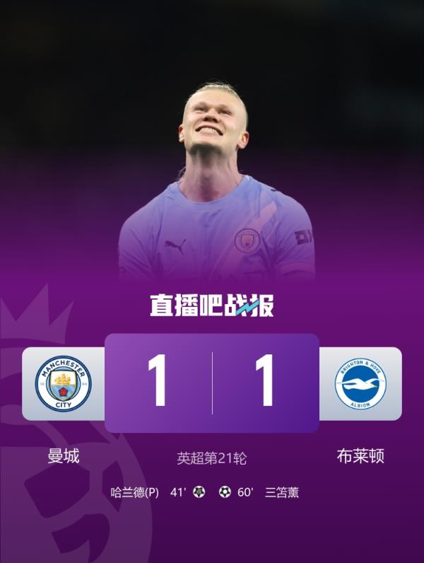 3连平!曼城1-1布莱顿先赛距榜首5分 哈兰德点射+失良机多库造点