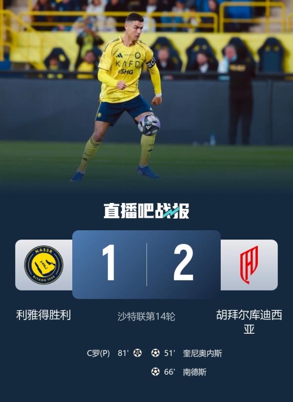 沙特联第14轮,利雅得胜利1-2不敌胡拜尔库迪西亚,C罗点射进球。