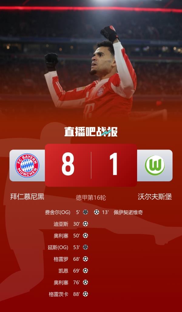 01月12日讯 德甲第16轮,拜仁8-1狂胜沃尔夫斯堡,半程还差一场,球队已经是51个净胜球+11分领跑德甲。