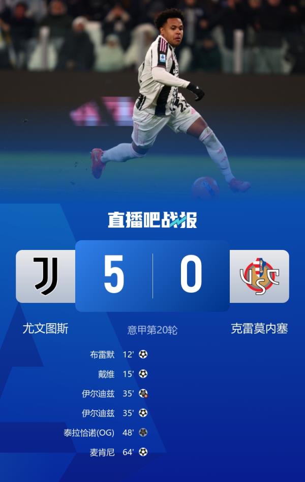 戴维、伊尔迪兹、麦肯尼破门,尤文5-0克雷莫内塞。
