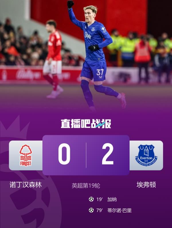 诺丁汉森林0-2埃弗顿,遭遇三连败,仍排在积分榜第17位。