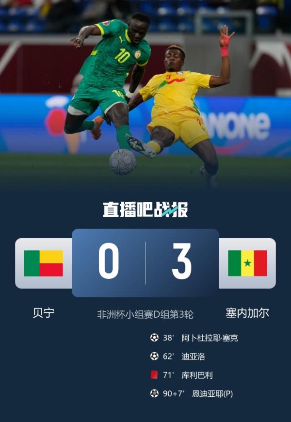十人塞内加尔3-0战胜贝宁,塞内加尔以D组头名身份出线,贝宁确定以小组第三晋级淘汰赛。