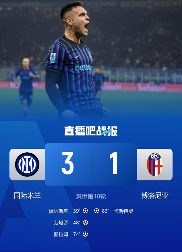 国米本轮3-1击败博洛尼亚,泽林斯基、劳塔罗、图拉姆破门。