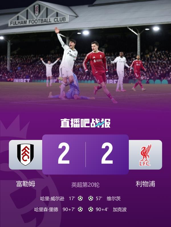 富勒姆2-2利物浦,本场比赛过程跌宕起伏,加克波补时破门,但里德世界波绝平。