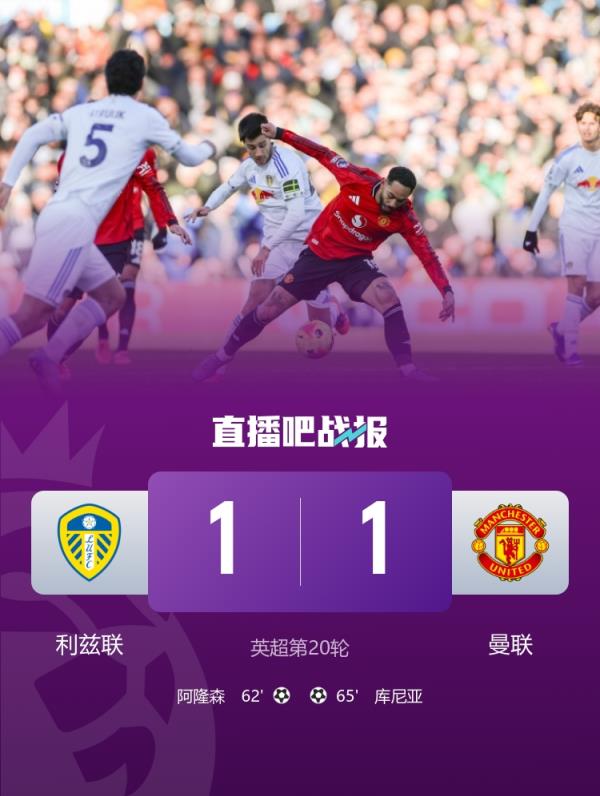 曼联1-1战平利兹联,近5轮英超仅1胜。本场齐尔克泽替补送助攻,库尼亚破门。